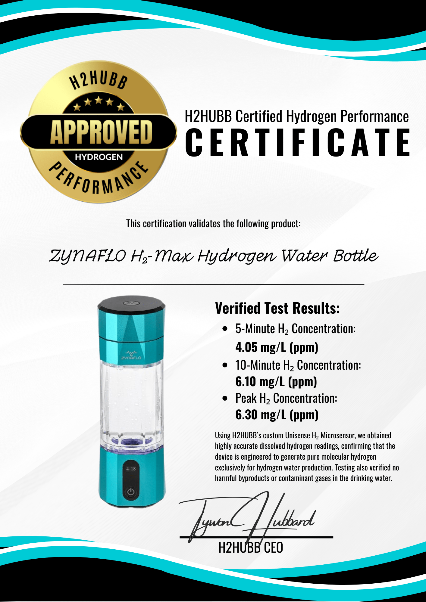 The Zynaflo H₂-Max Hydrogen Water Bottle is a high-pressure, portable hydrogen water system designed to deliver therapeutically relevant concentrations of dissolved molecular hydrogen. Independent H2HUBB testing using a laboratory-grade Unisense H₂ Microsensor confirmed consistent high performance, with average dissolved hydrogen concentrations of approximately 4.05 mg/L at 5 minutes and 6.10 mg/L at 10 minutes, and peak values reaching ~6.30 mg/L.