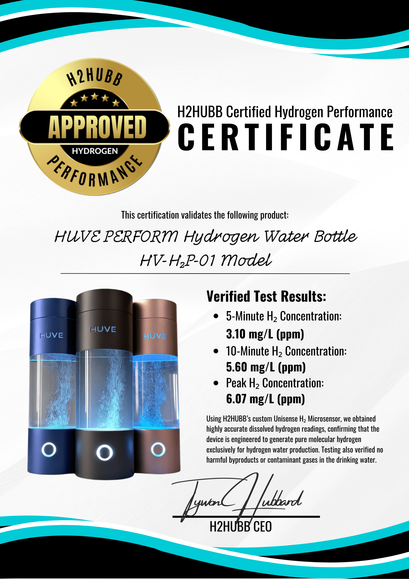 High-Concentration Hydrogen Water BottleThe HUVE Perform Hydrogen Water Bottle is a premium high-pressure (High-PSI) hydrogen-water generator engineered for users who want reliable, laboratory-verified hydrogen performance in a compact 230 mL portable system. Classified by H2HUBB as a high-concentration H₂ water device, it utilizes a PEM/SPE membrane to ensure pure hydrogen production across a wide range of water conductivities—including low-TDS distilled water.