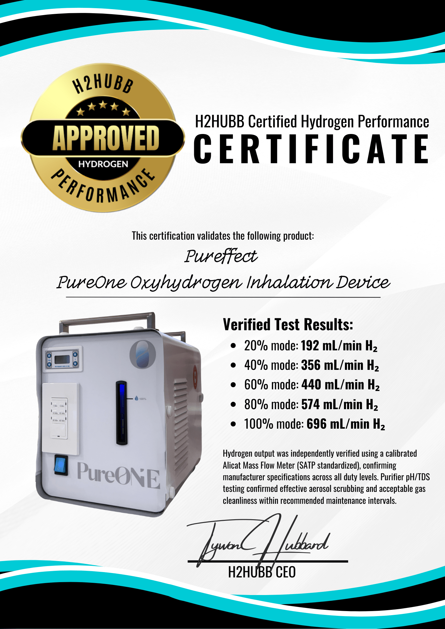 At average adult resting ventilation (6.5 L/min), these validated flow rates correspond to approximately 1.0–3.6% inhaled hydrogen concentration, placing the device within ranges commonly used in published human clinical research. The PureOne exceeds H2HUBB’s minimum inhalation performance standard of 120 mL/min and delivers therapeutically meaningful hydrogen dosing across all duty levels.
